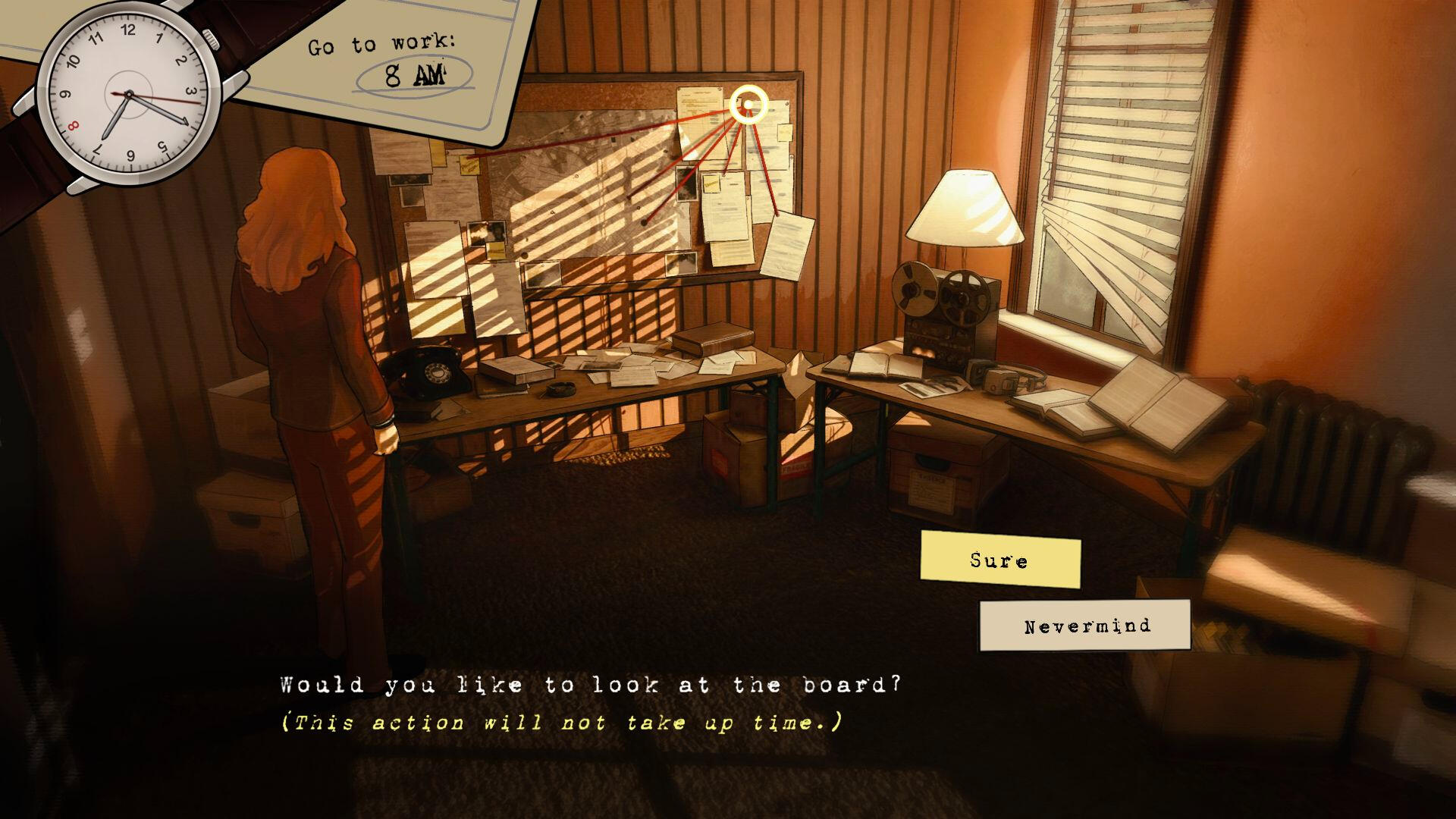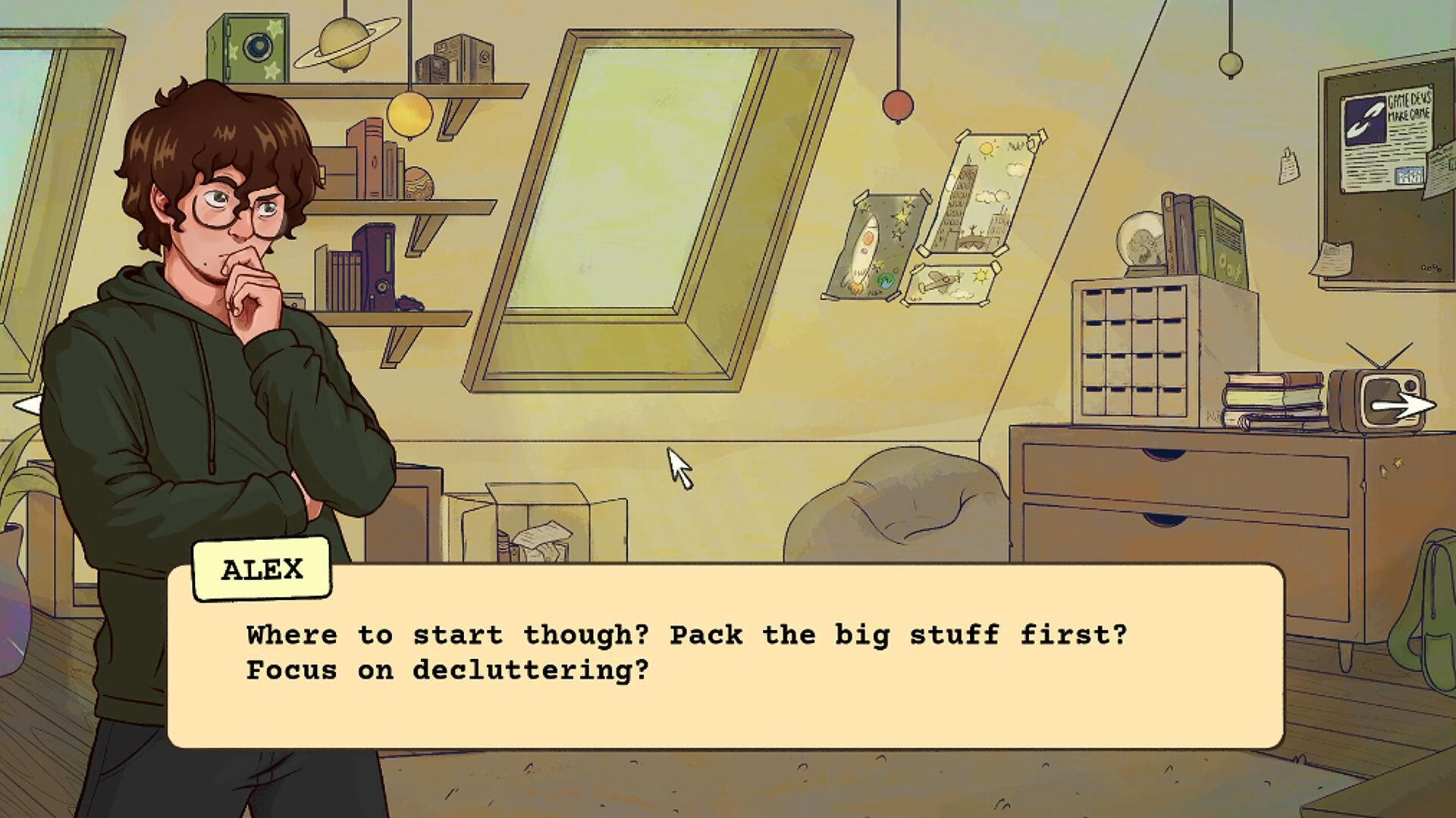 During the game, you'll have to keep an eye on the time, your mood, and your focus.Every action you take will have an effect on these stats, so you'll have to plan out your day carefully, because - just like in real life - you'll never have enough time or energy to do everything.The way you interact with the world also plays into this idea. It will not be made obvious to you that an item is interactable. It falls on you to click around and find out what you can investiagte.-------------------------------------------